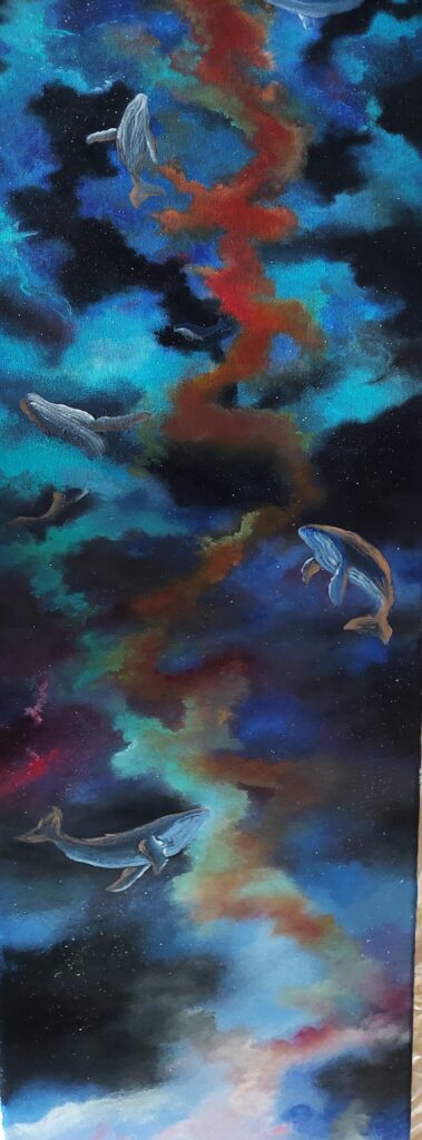 - Natalja Rockel findet Freude und Ruhe in der kreativen Arbeit und probiert sich gerne an verschiedenen Medien aus. Ihre Lieblingsmotive sind Wale sowie Galaxien. Aber auch verschiedene Landschaftsbilder finden sich in ihrem Atelier. „Der Wal ist für mich ein Symbol der inneren Ruhe, aber auch Stärke. Im Gegensatz dazu steht das große Ungewisse in Form des Weltalls, indem selbst das größte Säugetier der Welt klein wirkt, aber auch unglaublich schön. Für mich gehören die beiden einfach zusammen und symbolisieren die Fähigkeit dem großen Ungewissen Namens Leben mit Ruhe und Stärke zu begegnen.“