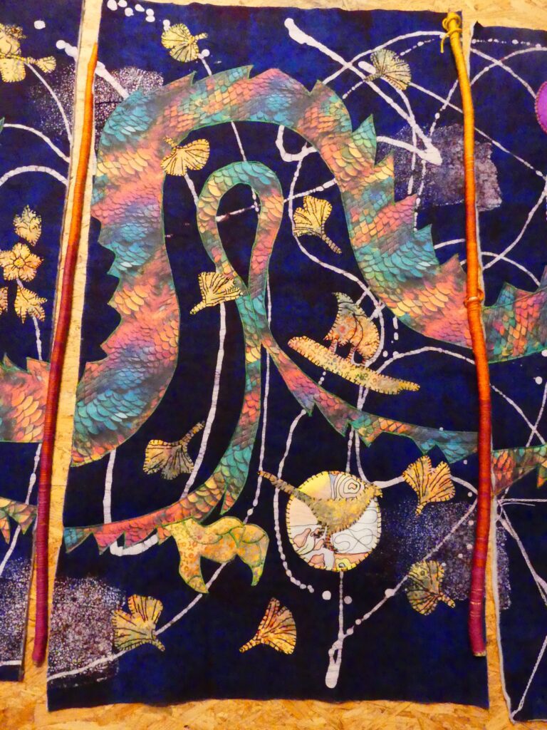 - Susanne Linnig: „Die Reise mit ihrem Drachen ging weiter, Welle um Welle. Ein frischer Wind kam auf und die goldenen Blätter der Hoffnung wehten vom Ginkgo, dem Drachenbaum Buddhas, und umwirbelten den Regenbogen-Drachen. Die Windsbraut, ein kleines Segelschiff, setze ihre Fahrt im Inneren des Drachen fort.